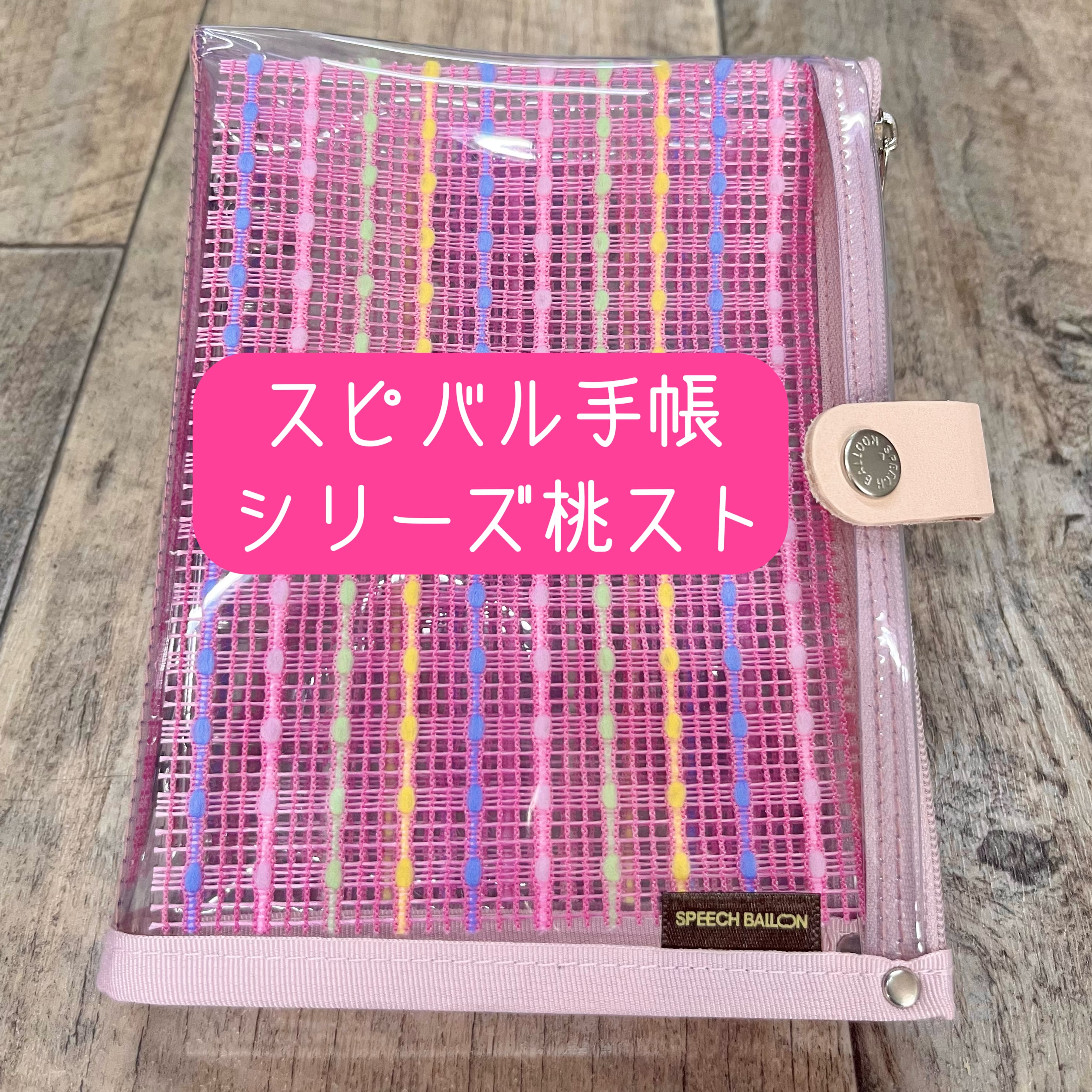 かわいいをまとめて、明日誰かに見せたくなる手帳。 スピーチバルーンの人気シリーズ「スピバル手帳」から、 ストライプメッシュが華やかな〈桃スト〉カラーが登場しました✨️ 透明素材×カラーメッシュで仕立てた“見せる手帳”は、 推し活にも、日常の文具整理にもぴったり。 お気に入りの付箋やステッカーを重ねて、 自分だけの「かわいい」を詰め込めます。 【仕様】 ・対応サイズ:A6リフィル対応(ロルバーンMも入ります) ・6穴バインダー内径:15mm/19mm ・本体サイズ:約165×130×25mm ・素材:透明ビニール+メッシュ生地 ・両サイドはファスナー式ポケット仕様(収納力◎) 【オプションでカスタマイズ可能】 〈バインダーのサイズ〉 ・M6内径15mm … 標準仕様。ロルバーンMも入ります。 ・M6内径19mm … たくさん入れたい方、厚めのリフィルを使う方におすすめ。 〈革手紐の長さ〉 ・10cm ・13cm ・13cm+ホック付き(中身が少ないとき短く留められます) ※標準はブラックの手紐仕様です。未選択時はブラックになります。 〈革手紐の色〉 ・ブラック(標準) ・他カラーに変更可能(仕入れ状況により若干色味が変わる場合があります) 〈ネームタグの色〉 ・チャコール ・赤ネーム ・緑ネーム ・クリアハートネーム ・茶色ネーム(新色)… 小さいネームが好みの方におすすめ。表紙写真の仕様です。 〈メッシュポーチの追加〉 ・本体と同色または異色メッシュの組み合わせが可能 ・ファスナー色の変更もできます(要お問い合わせ) 〈肩紐の有無〉 ※選択されていない場合は肩紐なしになります。 ・黒の肩紐 ・反射テープ付き肩紐 ・本体同色肩紐(黒樹脂送り) ・本体同色肩紐(シルバー金具送り) 【受注生産について】 受注製作のため、発送まで約2週間ほどお時間をいただきます。 お届けまでの時間も、どんな中身にしようか考えるワクワク期間としてお楽しみください。 【ご注意】 ・革手紐の在庫は仕入れ状況により色味が写真と若干異なる場合があります。 ・手作りのため、サイズに数ミリ程度の誤差が生じる場合があります。 ・ネームの付く位置がその時々で変わることがあります。 ピンクのストライプが見るたびに元気をくれる〈桃スト〉。 推し色でも、自分色でも、かわいいを重ねて楽しめるスピバル手帳です✨