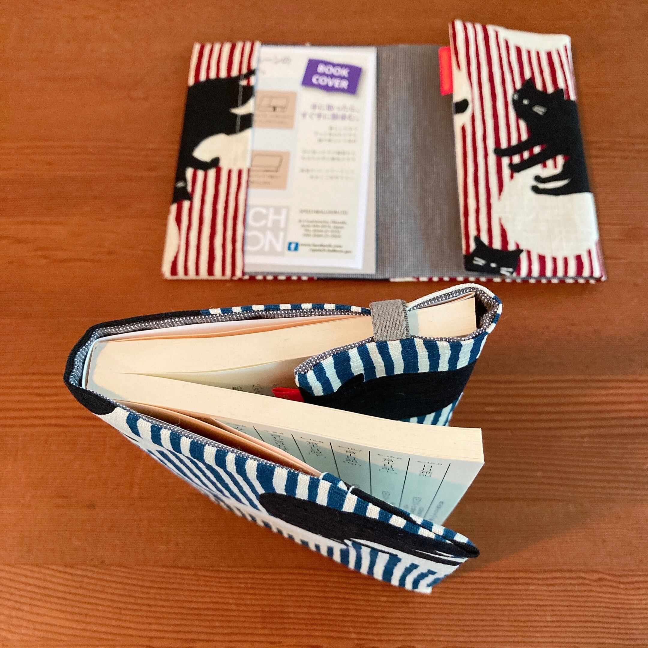 スピーチバルーンのブックカバー:文庫サイズ 猫柄が可愛い?? 3センチの厚みだって楽々カバー 月縞猫 何にだって似合っちゃう猫柄