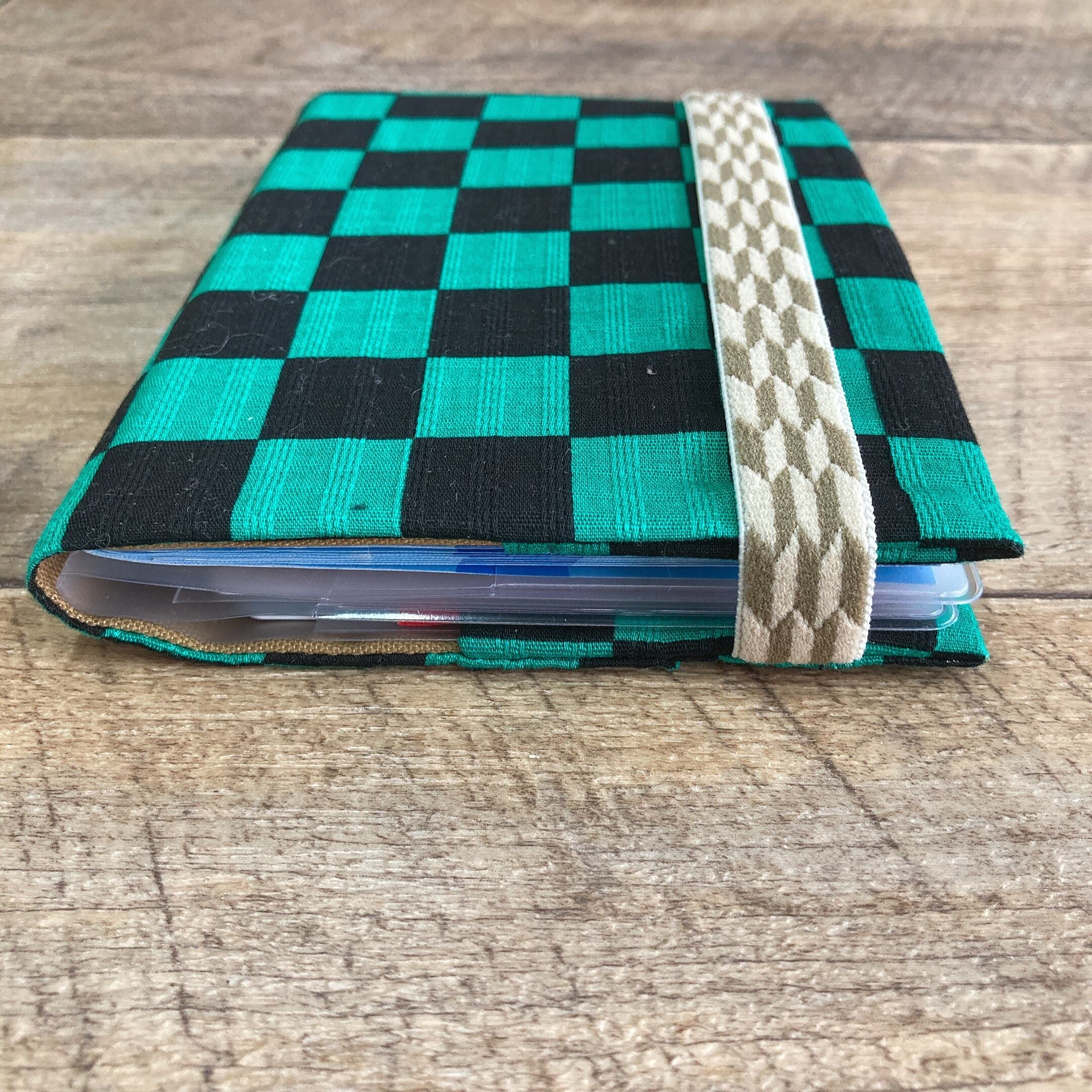 市松模様のお薬手帳カバーになります。 ゴムでホールドするタイプ。 <収納できる数> お薬手帳×2冊 カード×6枚 コピーやプリンターのインクがクリアの生地に付着しにくい素材を使っています。 <中のカードケース入れ> 素材:軟質ポリ塩化ビニール カードケース、布カバー共に日本製。1760