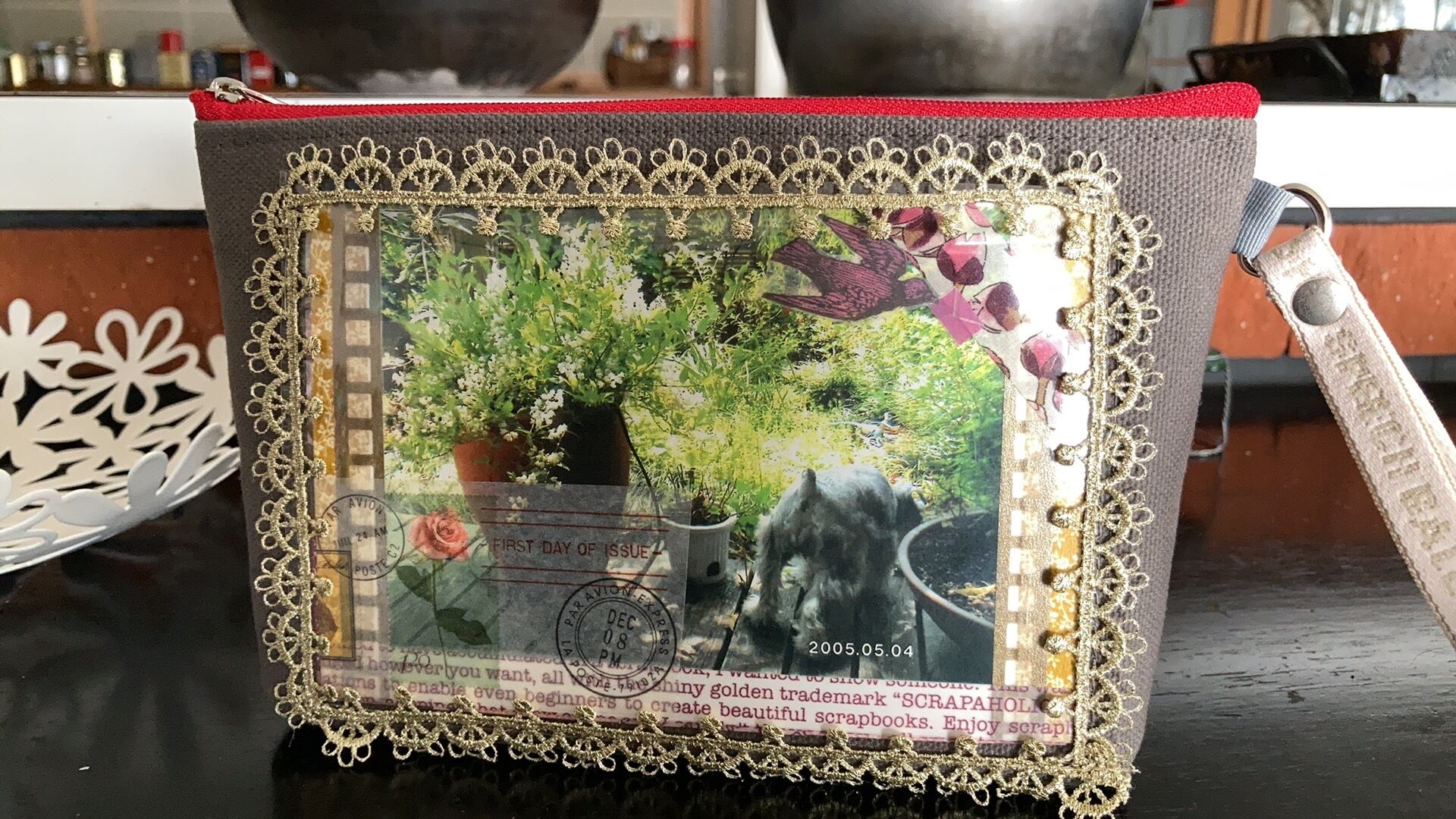 スピーチバルーンが贈るフィールホームポーチ 中身が少ない時はフラットに。 中身が入れば底の部分が出てきて立体になるポーチ。 会えない時間もそばに感じたい(*´ー`*) 家族、愛犬、愛猫、孫、恋人の写真など。 作るきっかけは看板犬のフェアリが他界して3年経つと言うこと。 いつまでもそばで感じていたい。 写真立ての中の写真は見ているようでいつの間にか見てはいない。 そこにあるのが当たり前で壁紙と同じで部屋の一つの風景になってしまったから。 どうしたらもっと写真を見てほっこりできるだろうか、、、。 考えました?? 額縁写真の上を行く! 写真を毎回変える楽しみ:変えた写真はしまわずそこにあって、いつでも新しくも前の写真にも変えられる。お気に入りのアルバムを持っているような感じになれる。 飾る場所を変える楽しみ:定位置だけではなく、持ち歩きポーチとして使える。 勿論、眺めて見る楽しみ:お気に入りの写真を決めて、しまわれているアルバムや、携帯の中から出す。 それらを一つにして楽しめるものがあれば良い! そして出来たのが、 フィールホームポーチの誕生です。 写真を入れるだけでも可愛くなるように、額縁はちょっとゴージャスなゴールドのレースを採用。 Decoれるなら写真にマステやシールを貼ってオシャレに演出。 自分のデザインのフィールホームポーチの出来上がり。