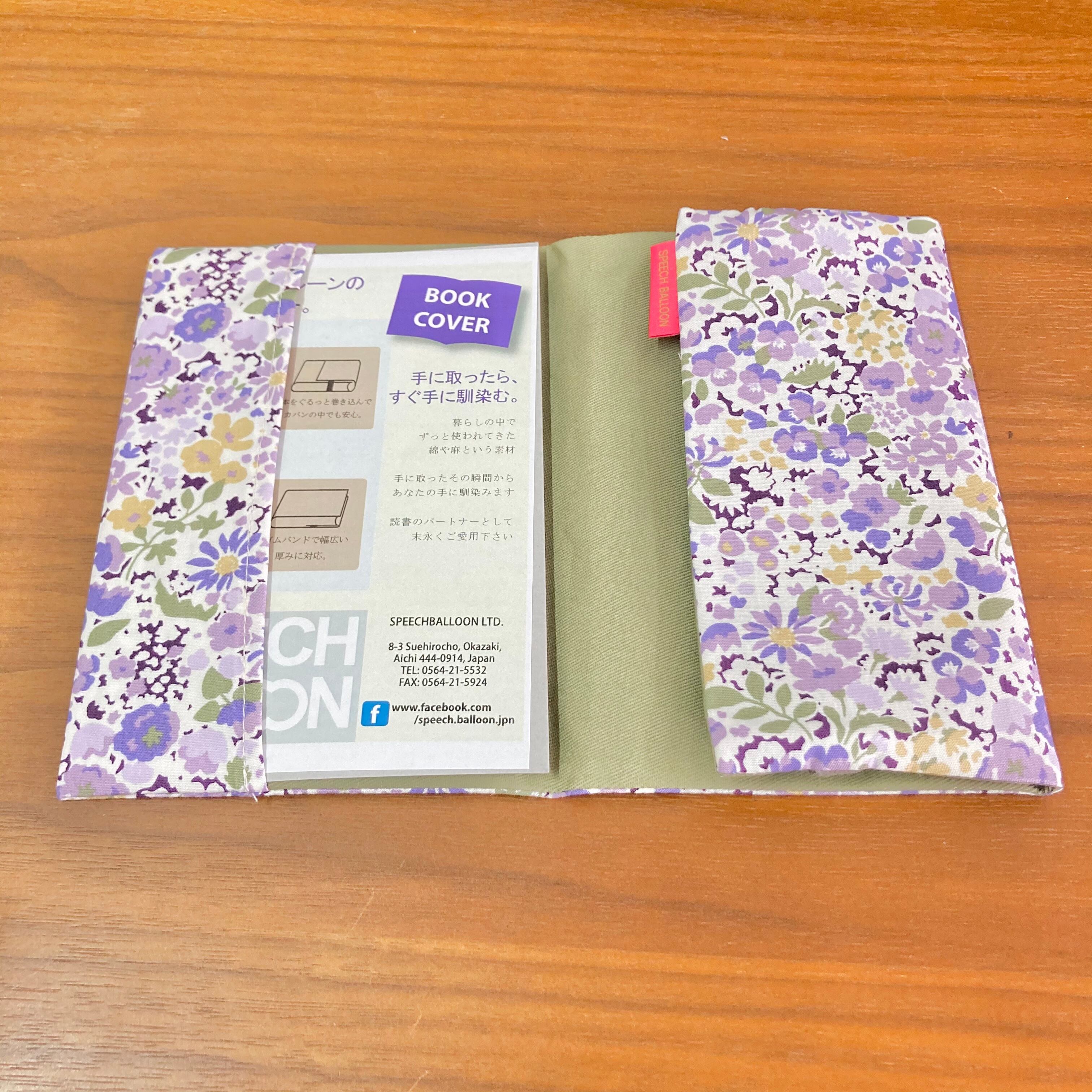 落ち着いた花柄がお洒落なブックカバー 細い線で描かれたシルケットと違い、塗りで描かれた優しい花達。 綺麗な色展開が服装に合わせて持ちたくなる。 そんなブックカバーです⁽⁽٩(๑˃̶͈̀ ᗨ ˂̶͈́)۶⁾⁾ ※お揃いのしおりは、speech balloonロゴプリントがプリントされています。 布が持つ力とは… それは布の温かみが心をゆったりとさせる力だとおもいます。 そして、お気に入りのカバーを着けることで、 その本へしっかり浸ることができます。 本を読む時間… 気持ちをリラックスして 大好きな音楽に飲み物を用意して もしかしたらおやつも❣️楽しい時間ですね。 紙を直接触るのも寒くなるこの時期、布の温かみを感じる本は指先の冷えにも優しいですよ。 読んでいる心も温かくなります( ´ ▽ ` ) さぁ、貴方だけのための上映会の始まり始まり〜♪ 文庫サイズは3センチの厚みだって楽々カバーします。 -------------------------------------------------------------------------------- 【ブックカバーの仕様について】 ①左側にポケットがあり、本の背表紙を差し込みます。 ②右側の生地を折り曲げ、ゴムを後ろに回してポケットを作ります。 ③右側にできたポケットに本の表紙を差し込みポケットのサイズを調整します ④途中まで読んだら、読み終えたところまでをポケットへしまいます。 ⑤後ろに回したゴムを表に回せば全体をホールド。読みたいときは、ゴムをまた後ろへ回します。 裏地は、その時々で織りと色が変わりますが綿を使用しています。 --------------------《送料について よく読んでくださいね m(_ _)m 》---------------------------- 【後払い+スマートレター】を選ばれましたら注文自体をキャンセル扱いする事になります。ご注意ください。 【後払い不可スマートレター】 を選ばれる際は、コンビニ決済など先に済ませる決済方法を選んで下さいませ。 決済方法で後払いを選択しても郵送方法として選ぶ事ができてしまいますが、ご注文頂いてもスマートレターは荷物がお客様のお手元に届いたかどうか『確認が取れない郵送方法』なので商品代金を請求する事が出来無いため、発送が出来ません。 請求書のお届けは、荷物到着日から換算して、最大で8日ほどでお手元に届きます。 よろしくお願いします。 made in JAPAN ここにはない柄もホームページのカタログには載っていることもありますよ。 http://www.speechballoon.com/