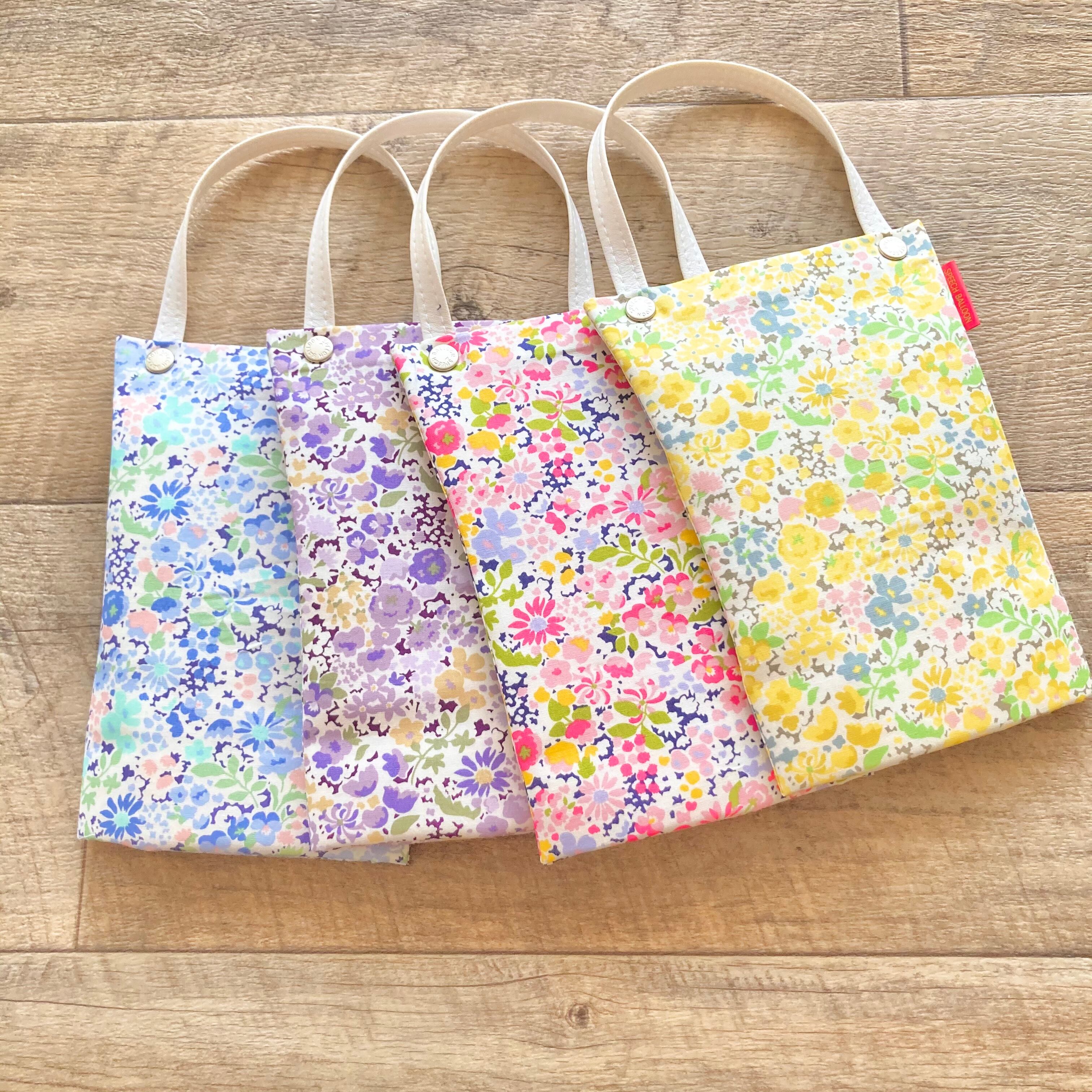 スピーチバルーンのペットボトルホルダー爽やかブルー、パープル、イエロー、ピンクの花が可愛い